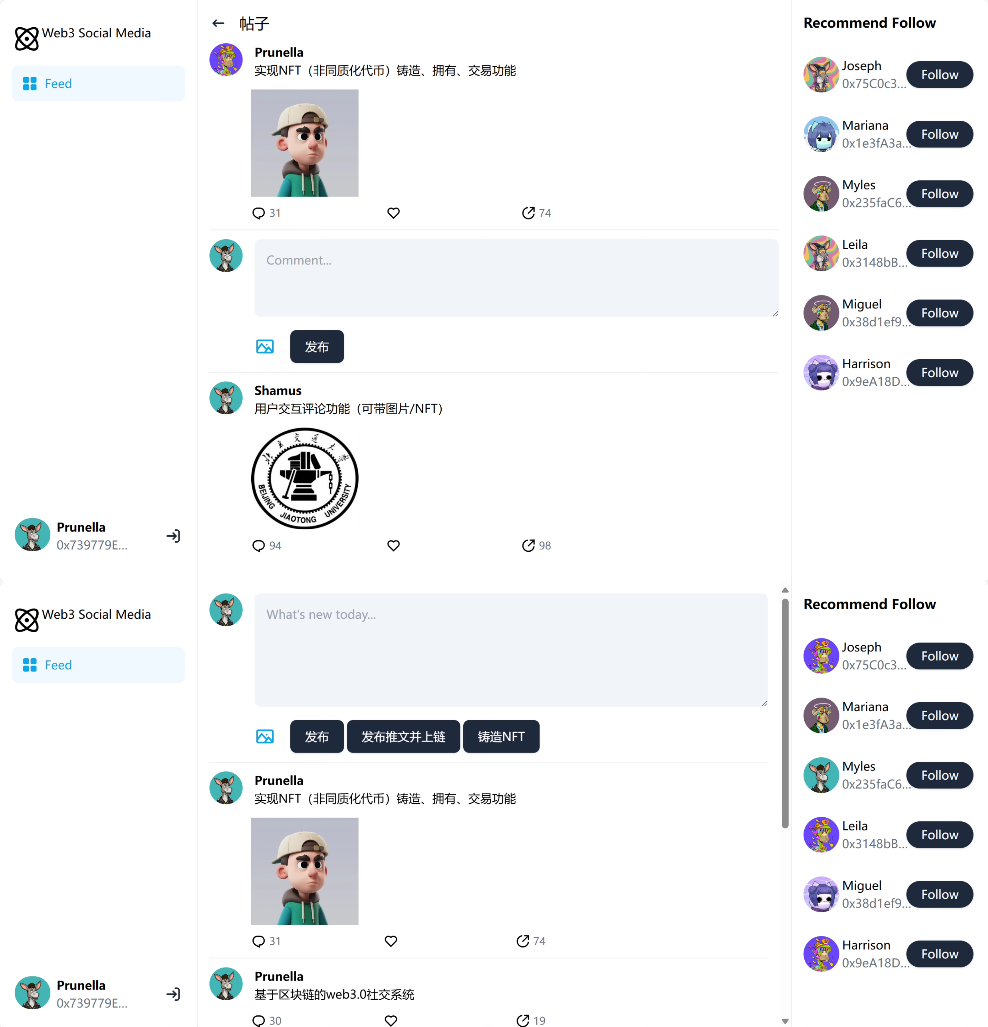 本项目开发了一种全新的Web3.0社交系统,核心技术基于区块链和智能合约,旨在解决当前中心化社交平台所面临的数据和权力中心化问题。该系统通过区块链技术对用户信息进行处理和记录,确保数据存储的不可篡改性。此外,该系统中引入了NFT(非同质化代币)的概念,允许用户铸造、拥有、交易其创作的内容,赋予了用户内容的所有权,也促进了创意作品的市场流通。通过这种方式,平台鼓励创造性工作和用户之间的正向互动,进一步增强了社交网络的活跃度和创造力。该社交系统能够为用户提供一个更加安全、透明、自由的网络交流空间,更符合当前对数字隐私和数据安全日益增长的需求,展现了Web3.0技术在现实应用中的巨大潜力,具有极高的科研价值和市场应用前景。