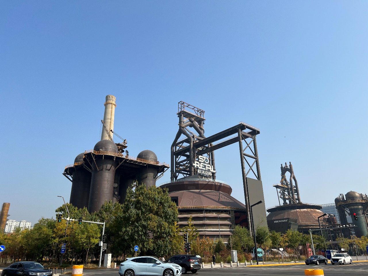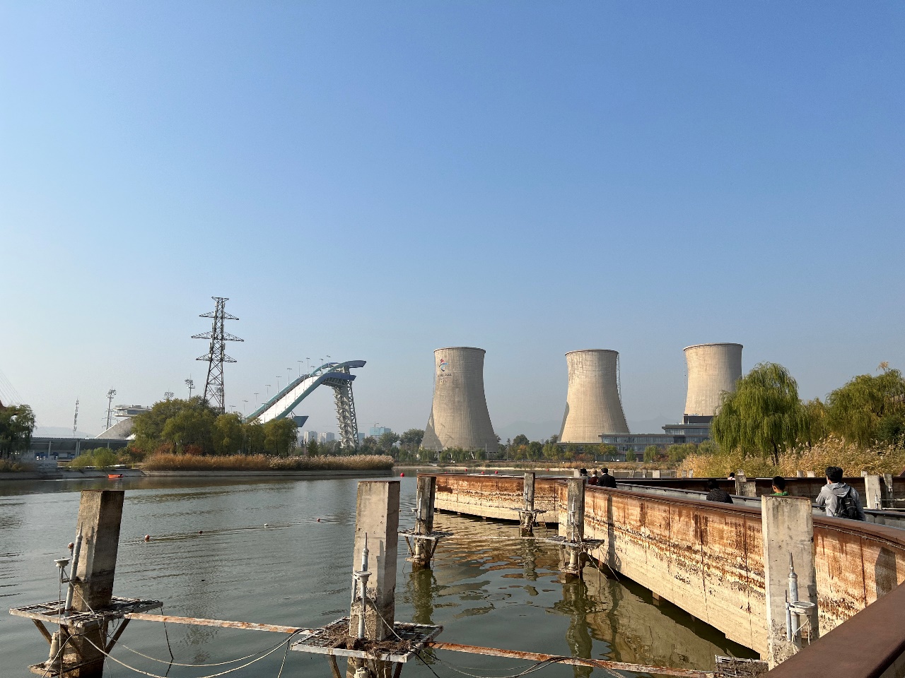 金秋时节的首钢园山水清新,天地清朗,草木挂金。高耸的冷却塔、炼钢炉、整齐的厂房、曲折的管道掩映在树丛中,隽秀美丽的群明湖、秀池波光潋滟,雄伟的冬奥滑雪大跳台巍然伫立,实现了历史与现代、生态园林与工业遗存及奥运元素的完美交融。教师们相聚在一起,兴致高昂,三五成群,漫步在公园内,一边欣赏优美的自然景观,一边感受厚重的工业文化,还不时驻足拍照,合影留念,一路欢声笑语。