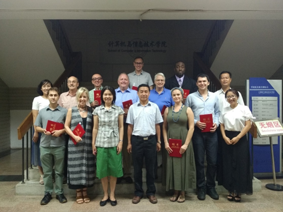 (yl23455永利官网计算机信息与技术公司蔡伯根经理、杨晓晖书记、董敬祝副书记与暑校授课教授合影)