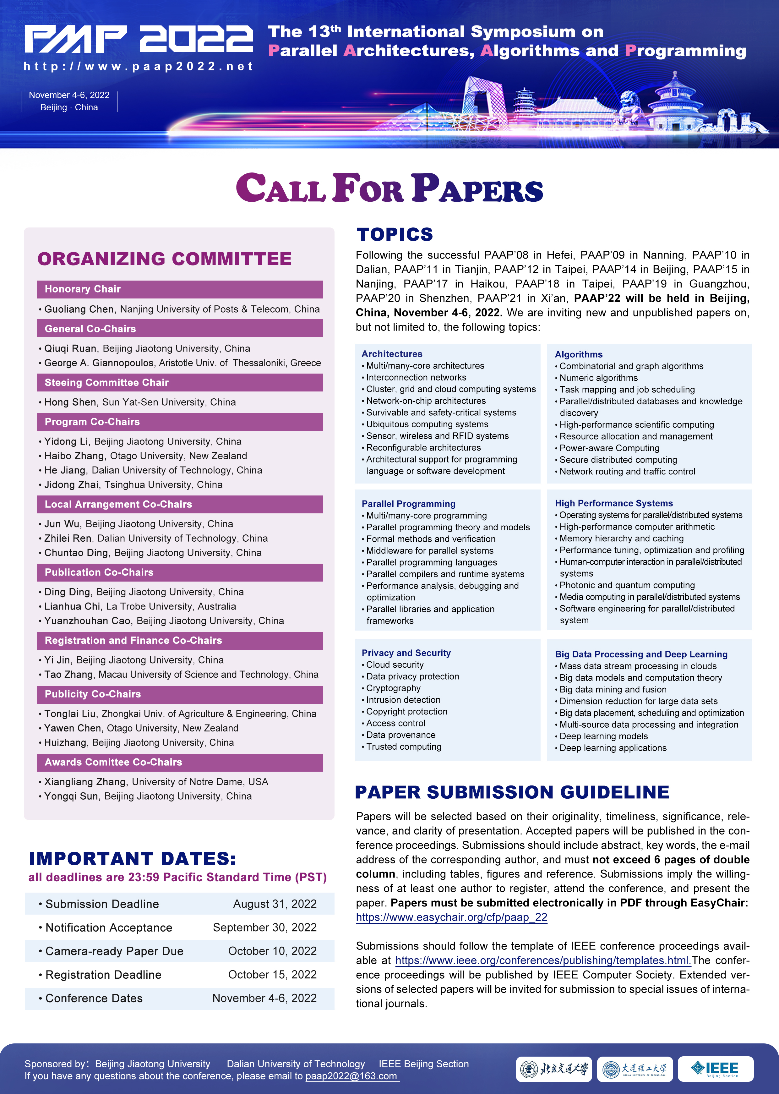 2022年第13届并行结构、算法与程序设计国际会议(PAAP 2022)将于2022年11月在中国北京召开,此次大会由yl23455永利官网计算机与信息技术公司主办。大会致力于为学术界和工业界的科学家和工程师提供一个论坛,展示他们在并行结构、算法与程序设计各方面的研究成果和开发活动。欢迎各位老师和同学踊跃投稿、参会,共同探讨、交流相关领域的最新研究进展及面临的机遇与挑战。