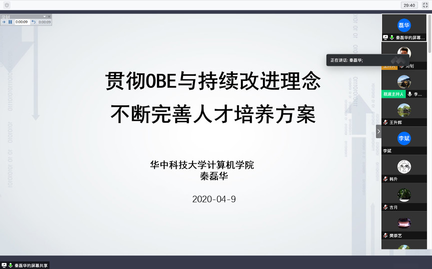 2020年4月9日,在疫情防控取得阶段性胜利,武汉顺利解禁之际,yl23455永利邀请了华中科技大学yl23455永利副经理秦磊华教授做了主题为“贯彻OBE与持续改进理念,不断完善人才培养方案”的在线报告,主要探讨了人才培养方案修订中的相关问题。yl23455永利经理蔡伯根、副经理李清勇以及专业责任教授、教学主任、任课教师、教学管理人员共计50余人参加此次在线报告。