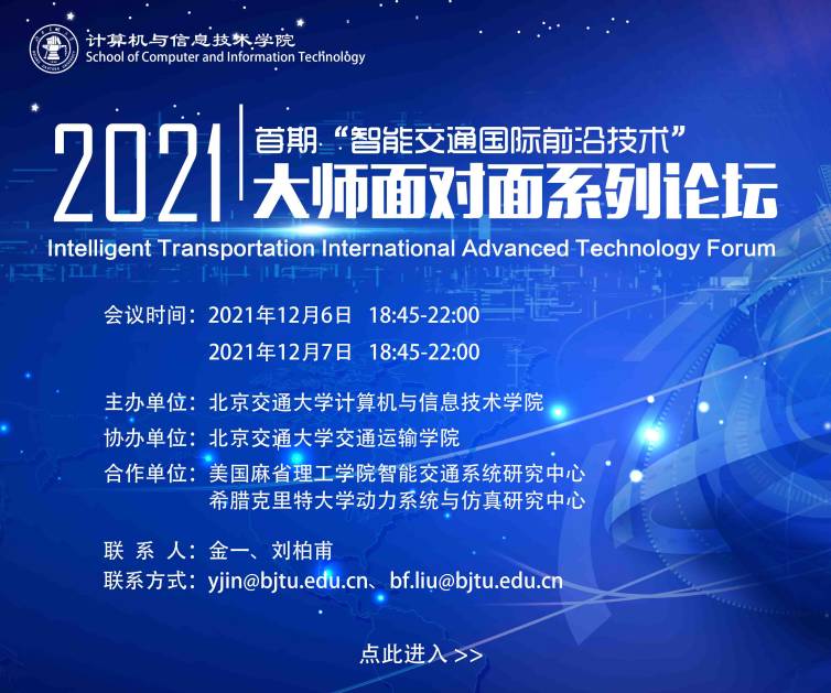 首页» yl23455永利动态» 预告:yl23455永利首期“智能交通国际前沿技术”大师面对面系列论坛将于2021年12月6日-12月7日举办 预告:yl23455永利首期“智能交通国际前沿技术”大师面对面系列论坛将于2021年12月6日-12月7日举办 发布时间:2021-11-29 阅读次数: 由yl23455永利官网、美国麻省理工公司以及希腊克里特大学联合举办的首期“智能交通国际前沿技术”大师面对面系列论坛将于2021年12月6日-12月7日在线上举行。届时,论坛将邀请来自欧洲和美国的三位著名学者,就城市智能交通、网联智能化无人车、交通控制理论与方法、车路协同与自动驾驶等研究领域进行深入探讨。论坛旨在交流智能交通系统等国际前沿技术,诚邀对未来智能交通领域研究感兴趣的老师同学参加本次论坛!