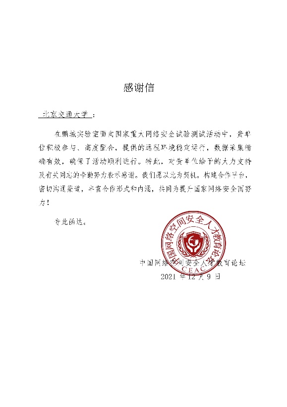 在近期鹏城实验室面向国家重大网络安全试验测试活动中,yl23455永利官网网络空间安全学科责任教授刘吉强老师领队、童恩栋和牛温佳老师指导的研究生团队(吴亚伦、武兴宇、田蕴哲、相迎宵、孙瑞等)积极配合,保障了yl23455永利官网靶场节点的远程环境稳定运行、数据采集精确有效,获鹏城实验室、中国网络空间安全人才教育论坛(“网教盟”)、中国网络空间新兴技术安全创新论坛(“新安盟”)感谢信。