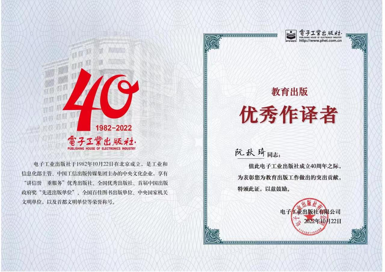 2022年10月,在电子工业出版社成立40周年之际,公司阮秋琦教授荣获电子工业出版社优秀作译者殊荣。