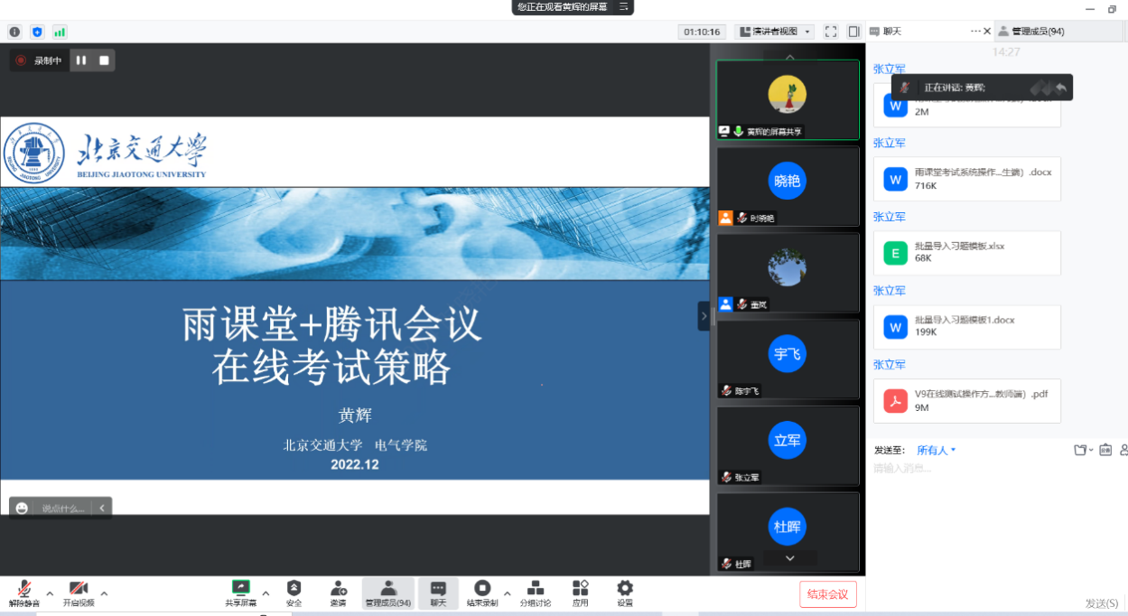 本次会议邀请到了北京市教学名师、电气公司教授黄辉老师和校教师发展中心新媒体组骨干、电子与信息工程公司张立军老师,面向yl23455永利全院老师通过腾讯会议做了期末线上考试培训与经验分享。两位老师分别就如何使用雨课堂、课程平台组织出题、监考、防止作弊等进行了详细介绍和分享。全校90多位老师参加了本次活动,参会老师们与两位报告专家在线上进行了热烈的交流和讨论。