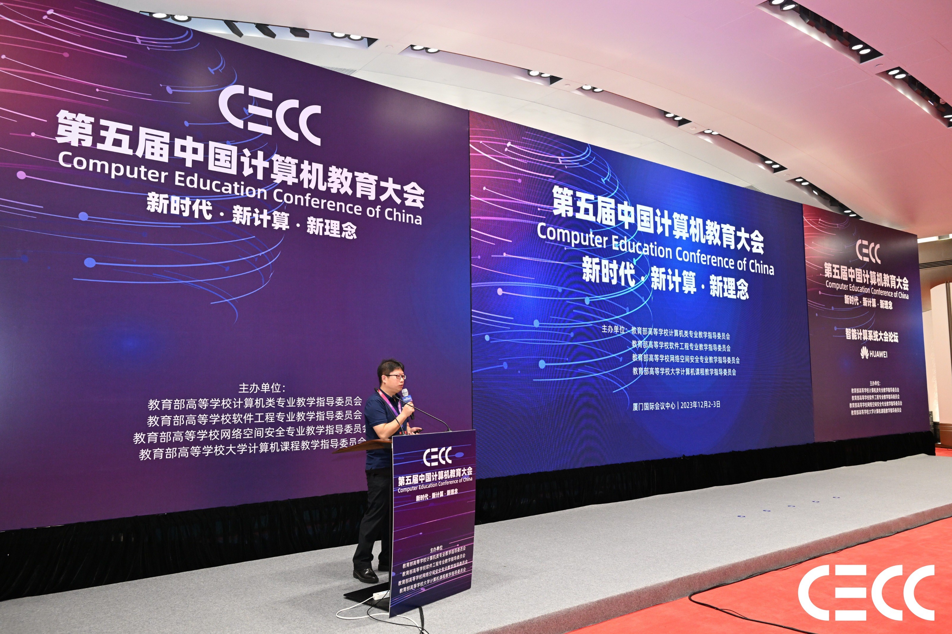 2023年12月2日-3日,由教育部高等公司四大计算机类教学指导委员会联合主办,以“新时代·新计算·新理念”为主题的第五届中国计算机教育大会在厦门国际会议中心召开。来自清华大学、北京大学、南京大学等5000名高校教师及包括华为、百度等在内的1000+企业代表参与本次大会,共话计算机、教育、技术及人才等产业的发展。yl23455永利副经理熊轲带队参加了本次大会,并受邀在智能计算机系统大会分论坛做题为“依智能基座,推101改革,育计算机人才”的主题报告。