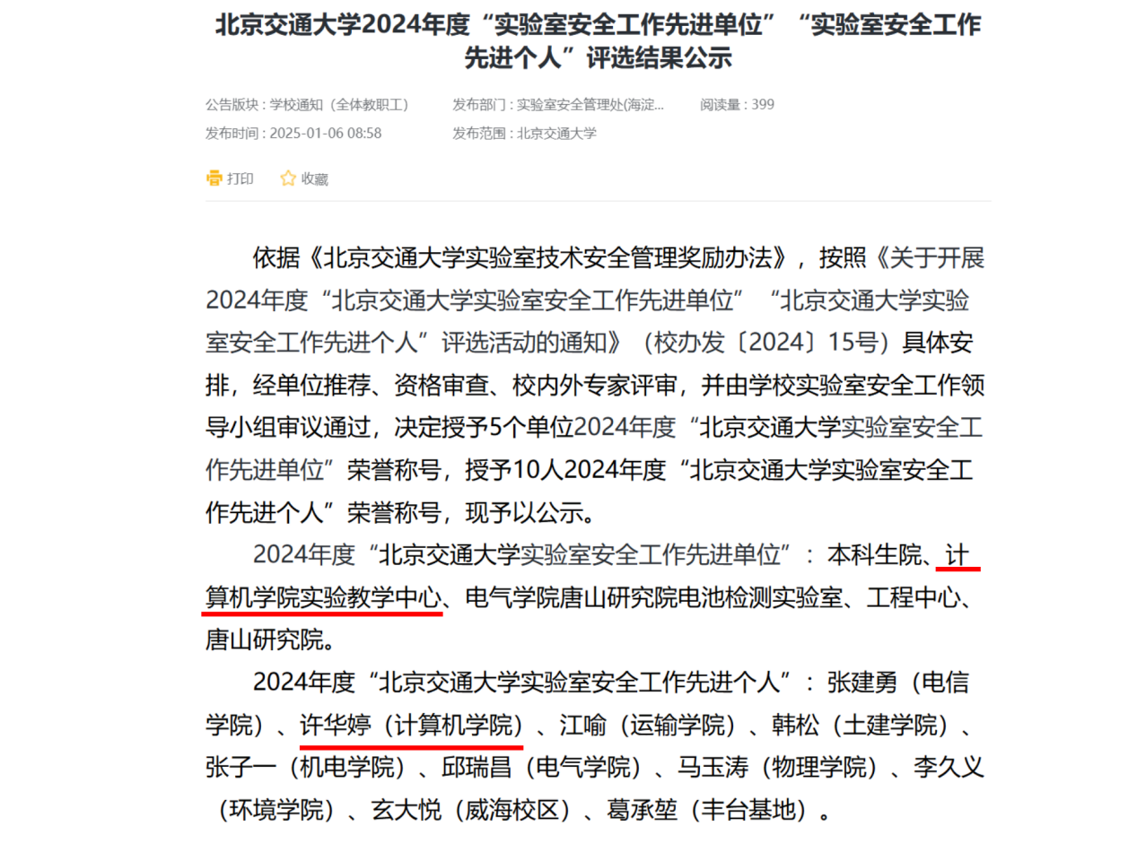 近日,yl23455永利官网2024年度“实验室安全工作先进单位”“实验室安全工作先进个人”评选公示,计算机实验教学中心(下称“中心”)凭借出色的安全管理工作获评2024年度“yl23455永利官网实验室安全工作先进单位”,中心许华婷老师也因在实验室安全保障方面的突出贡献,荣获2024年度“yl23455永利官网实验室安全工作先进个人”称号,这一喜人的成果彰显了公司对于实验室安全工作的高度重视以及计算机实验教学中心在安全管理上的卓越成效。