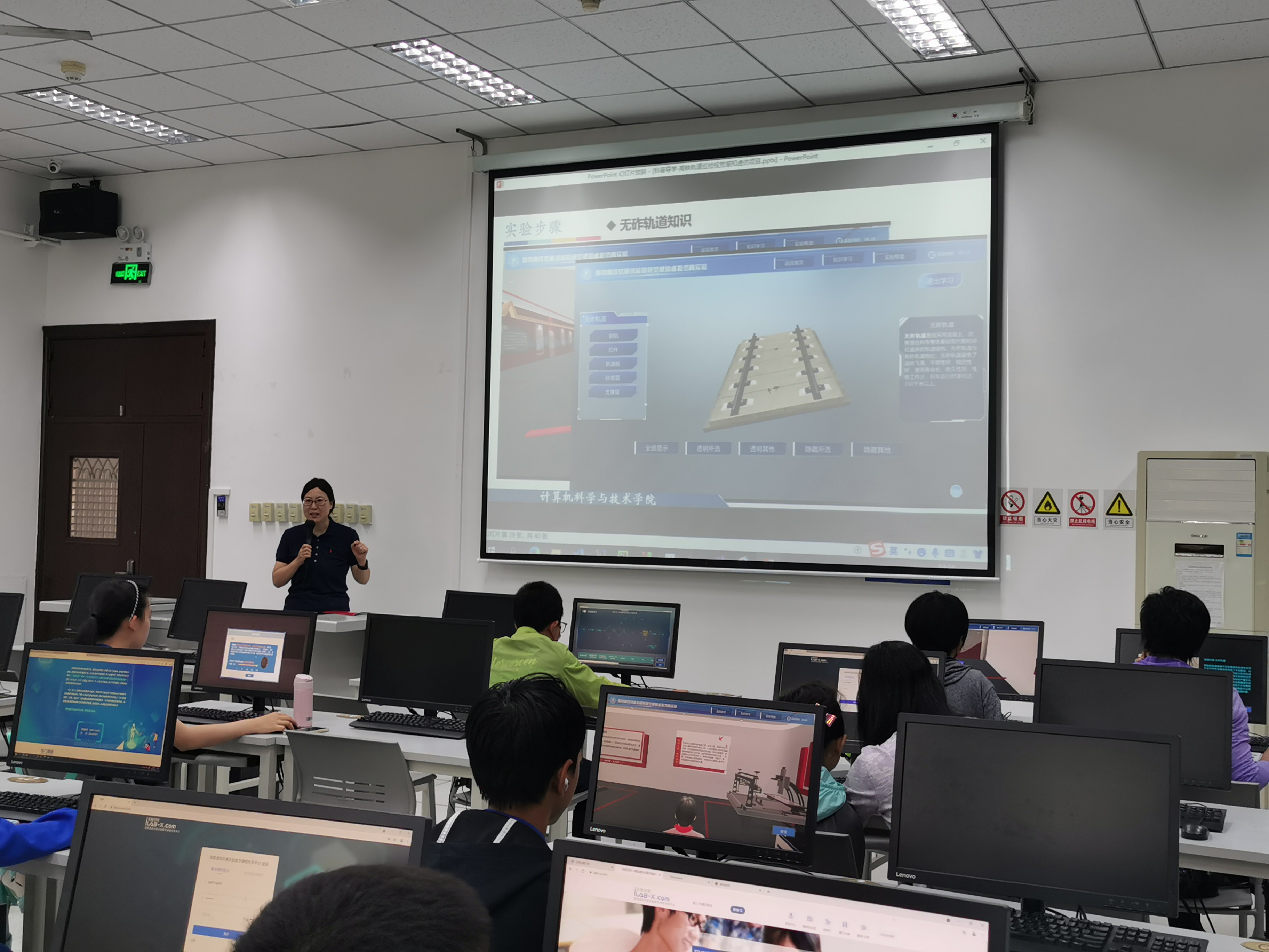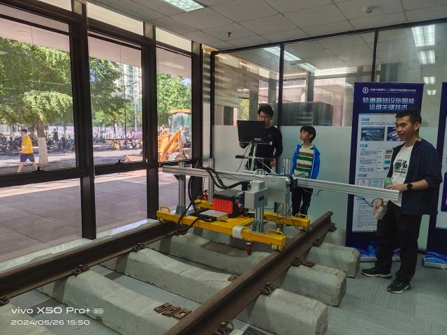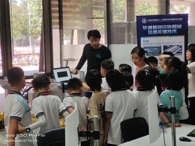 在主校区逸夫101科普基地实验室举办的科普展览每天开放,让来访者们沉浸在科学的世界中。在科普基地中展示的平行驾驶平台,小朋友们踊跃参与试驾体验,都成为小小“AI驾驶员”。通过对铁路轨道和智能巡检车的观察和操作,小朋友们对人工智能技术和应用有了更直接的感悟。