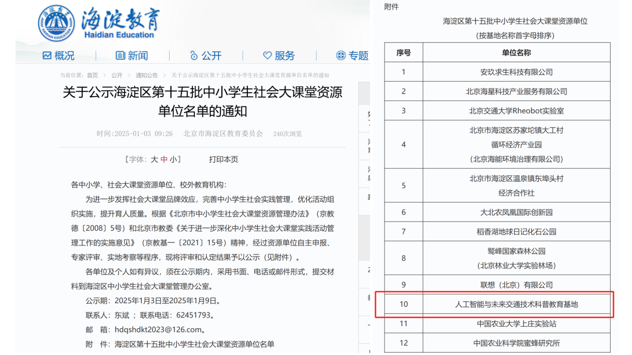 人工智能与未来交通技术科普教育基地成功入选海淀区第十五批中小员工社会大课堂资源单位
